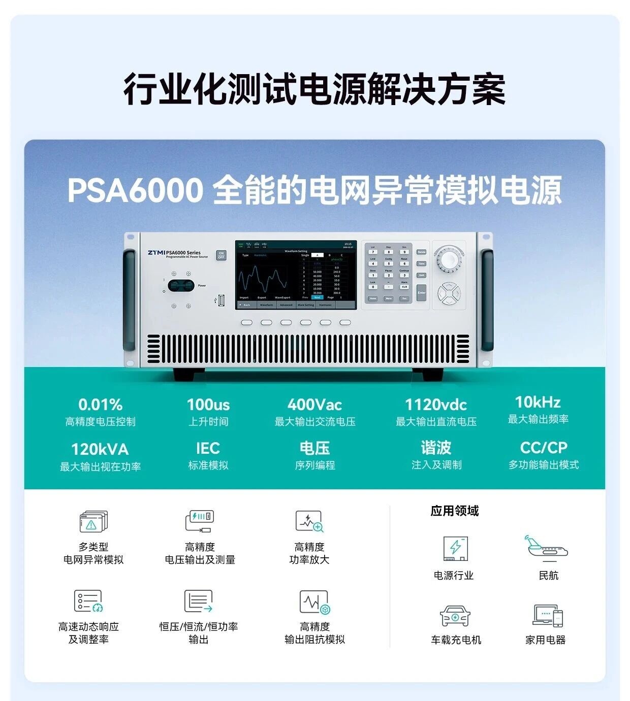 總諧波失真度(Total Harmonic Distortion, THD),是衡量測試交流電源的核心指標,代表其輸出波形的純凈度和保真度,同時也關系到測試結果的真實與否。很多高精密行業對THD有很高的要求,PSA6000系列帶載最低THD可低至0.03%,達到業內領先水平。